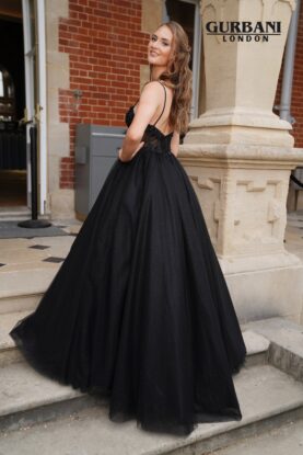 Elegant black tulle prom dress featuring a floral corset bodice, sweetheart neckline and full glitter layered skirt. Designed for a dramatic, voluminous silhouette with subtle sparkle, perfect for prom and formal events.