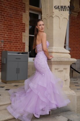 The silhouette flows into a dramatic mermaid-style skirt with layered tulle detailing, adding volume, movement and a soft, ethereal finish. The extended train creates a show-stopping entrance, making this gown perfect for standout moments.