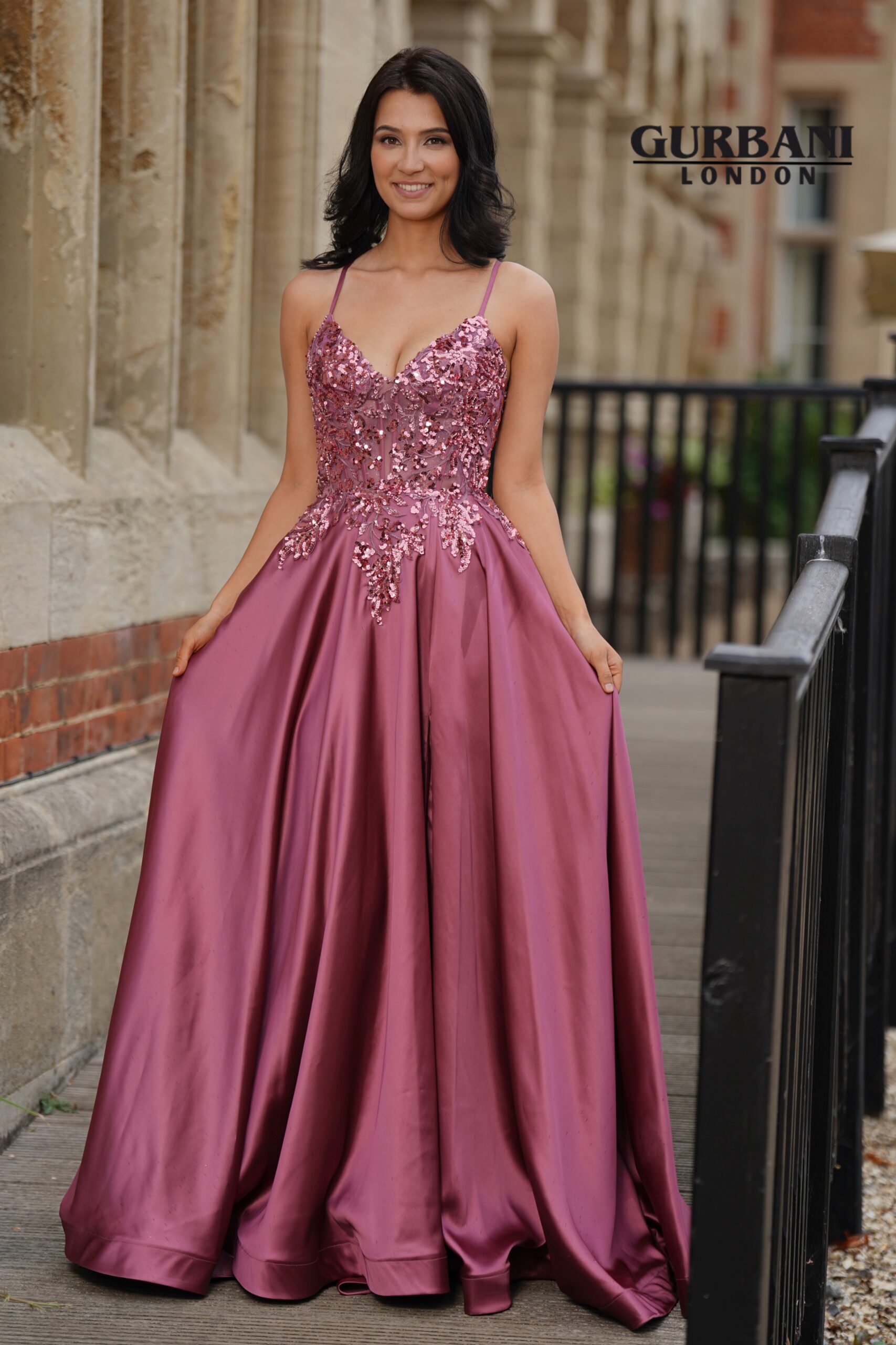 Features: Beaded and sequin detailing, floral motif bodice, structured fit, flowing skirt, soft sheen finish