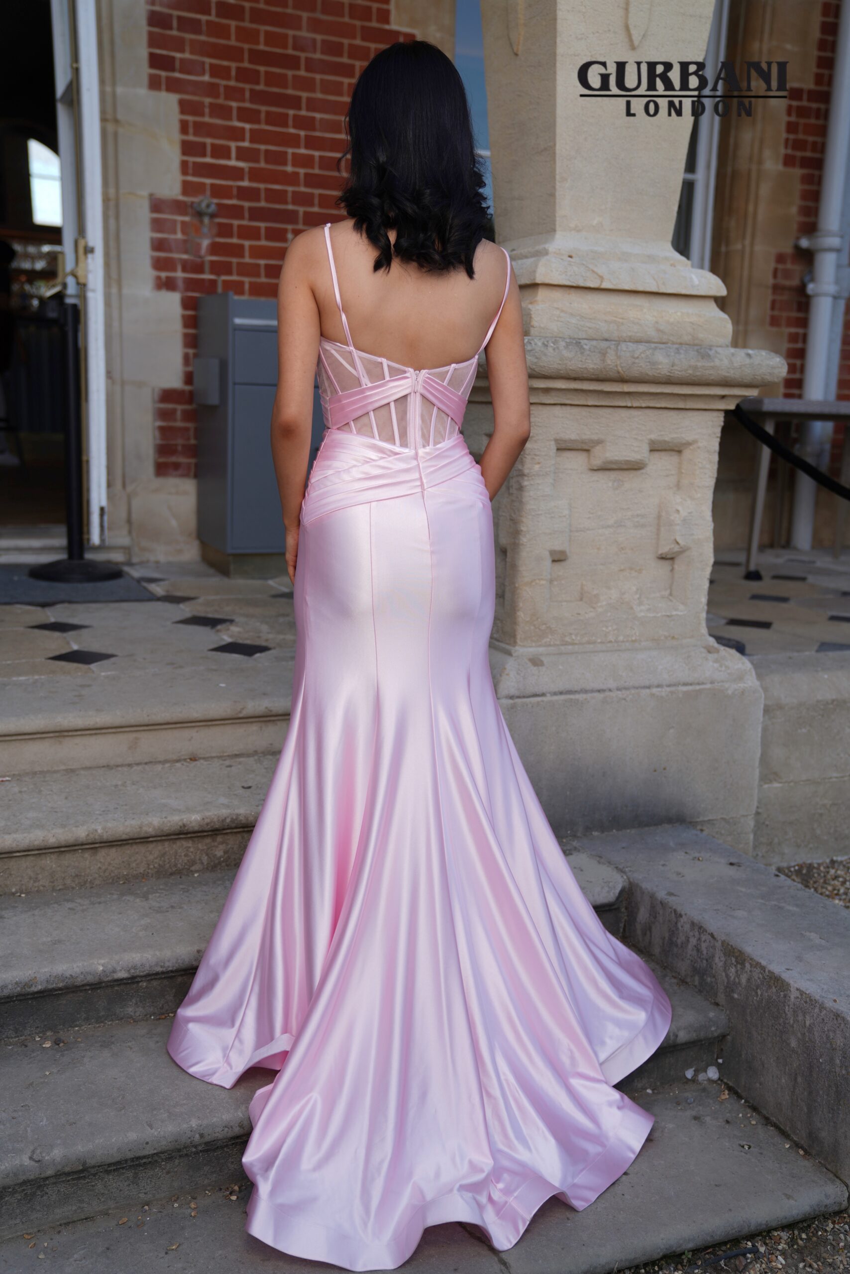 Features: Ruched corset bodice, sheer mesh panels, body-contouring fit, flared hem, sweeping train